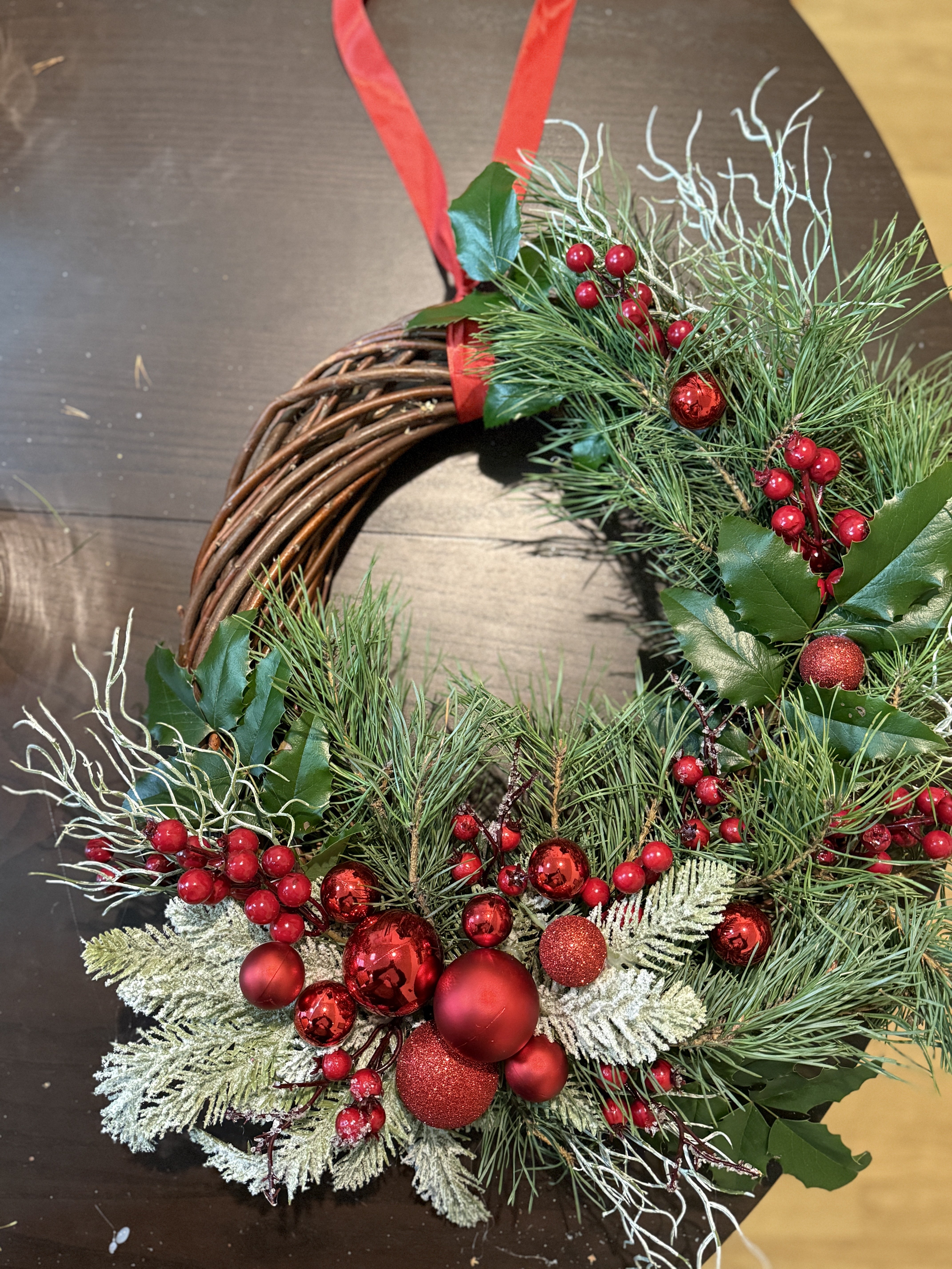 Na tym etapie wianek zaczyna już wyglądać świątecznie, ale to dopiero fundament.